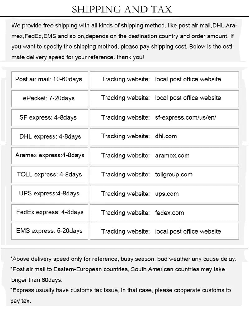 Products shipped within the United States via Standard Shipping will arrive in 4-12 days. Products shipped from China to the United States will arrive in 10-15 days via International Delivery. Tracking is available for all shipments. Shipping costs a flat rate of $6.99, but all orders over $100 qualify for free shipping.